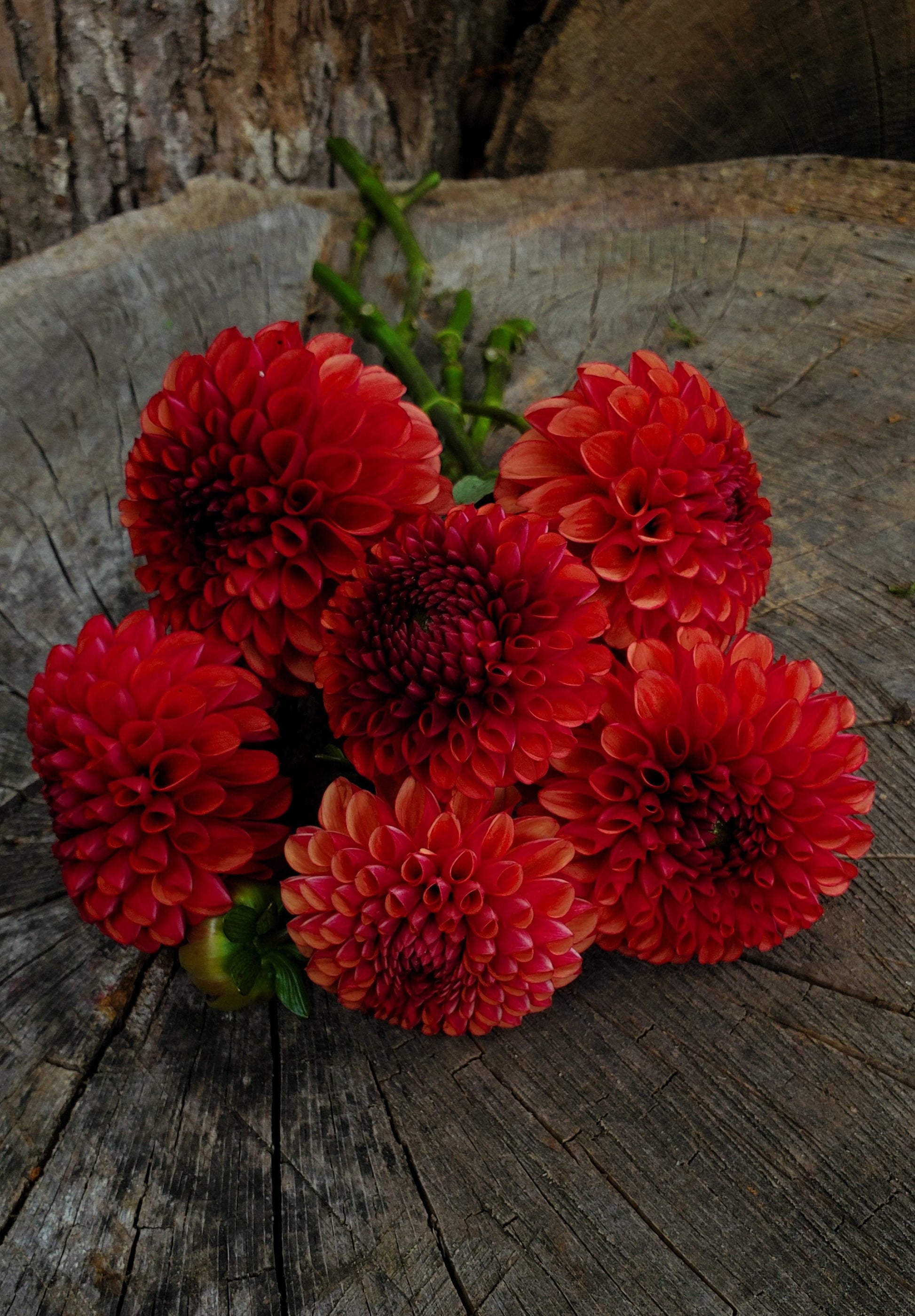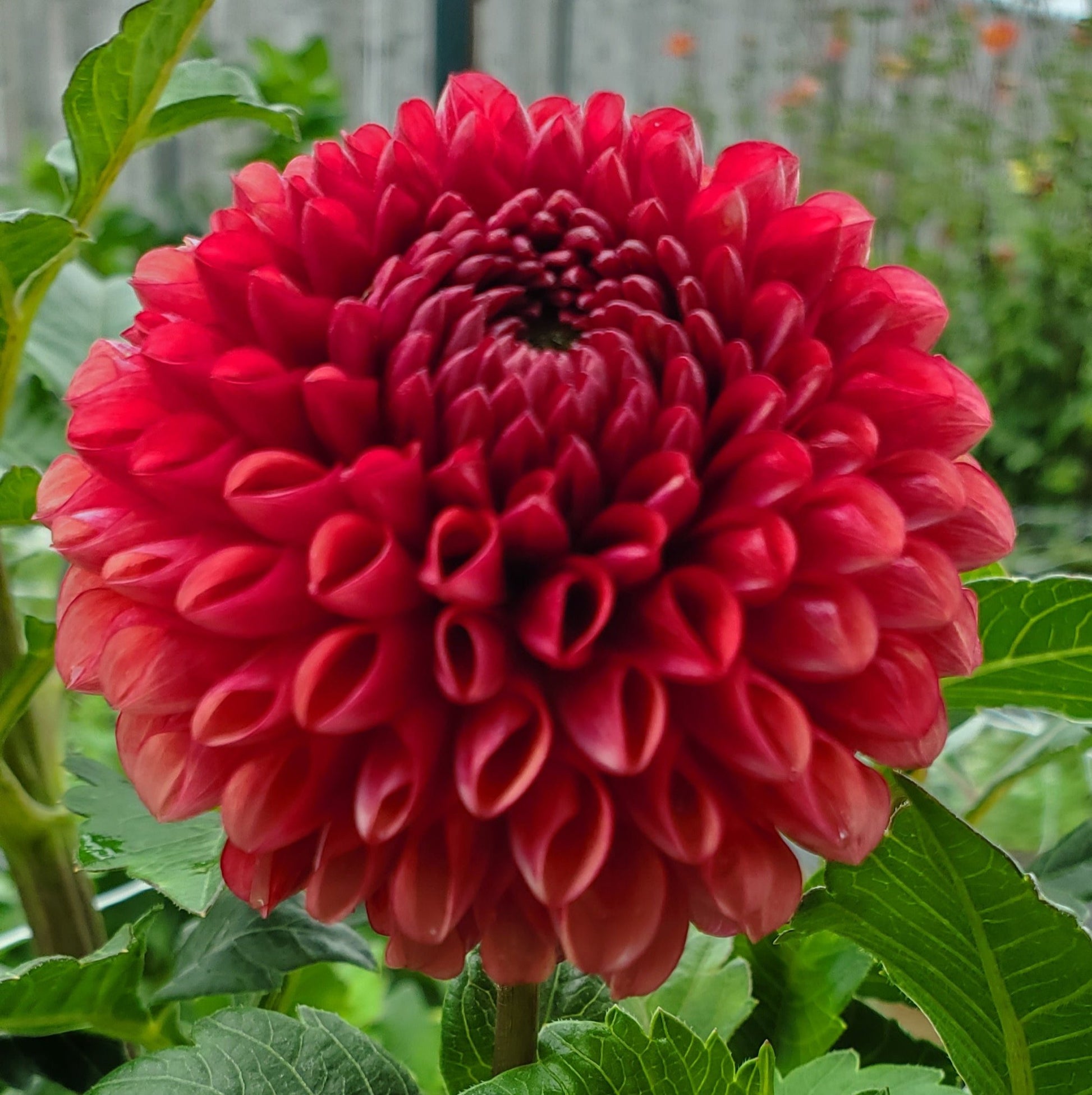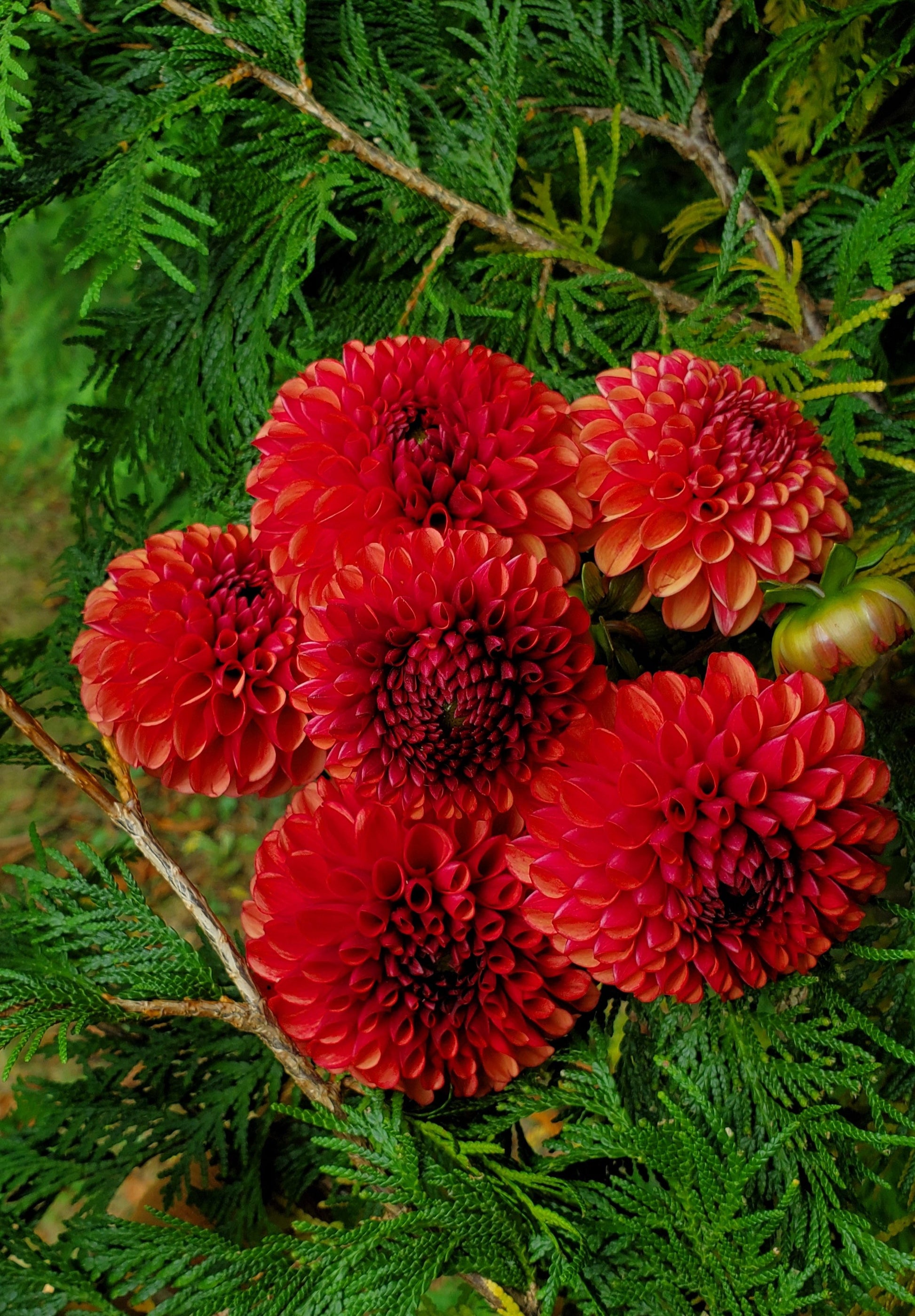 Deep rust, red blooms. Sometimes the center almost looks burnt. A drop-dead gorgeous ball that one should make a place in the garden for.