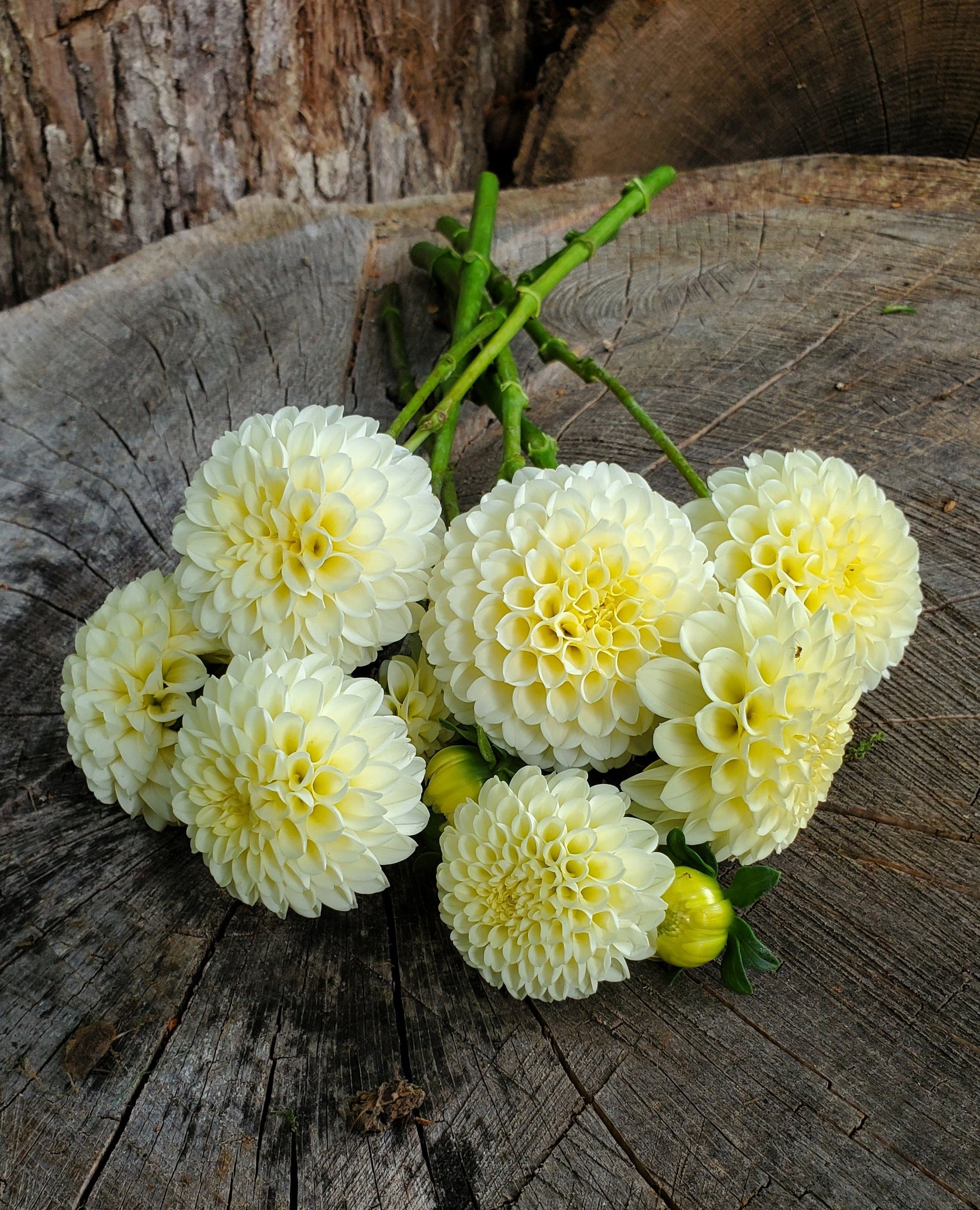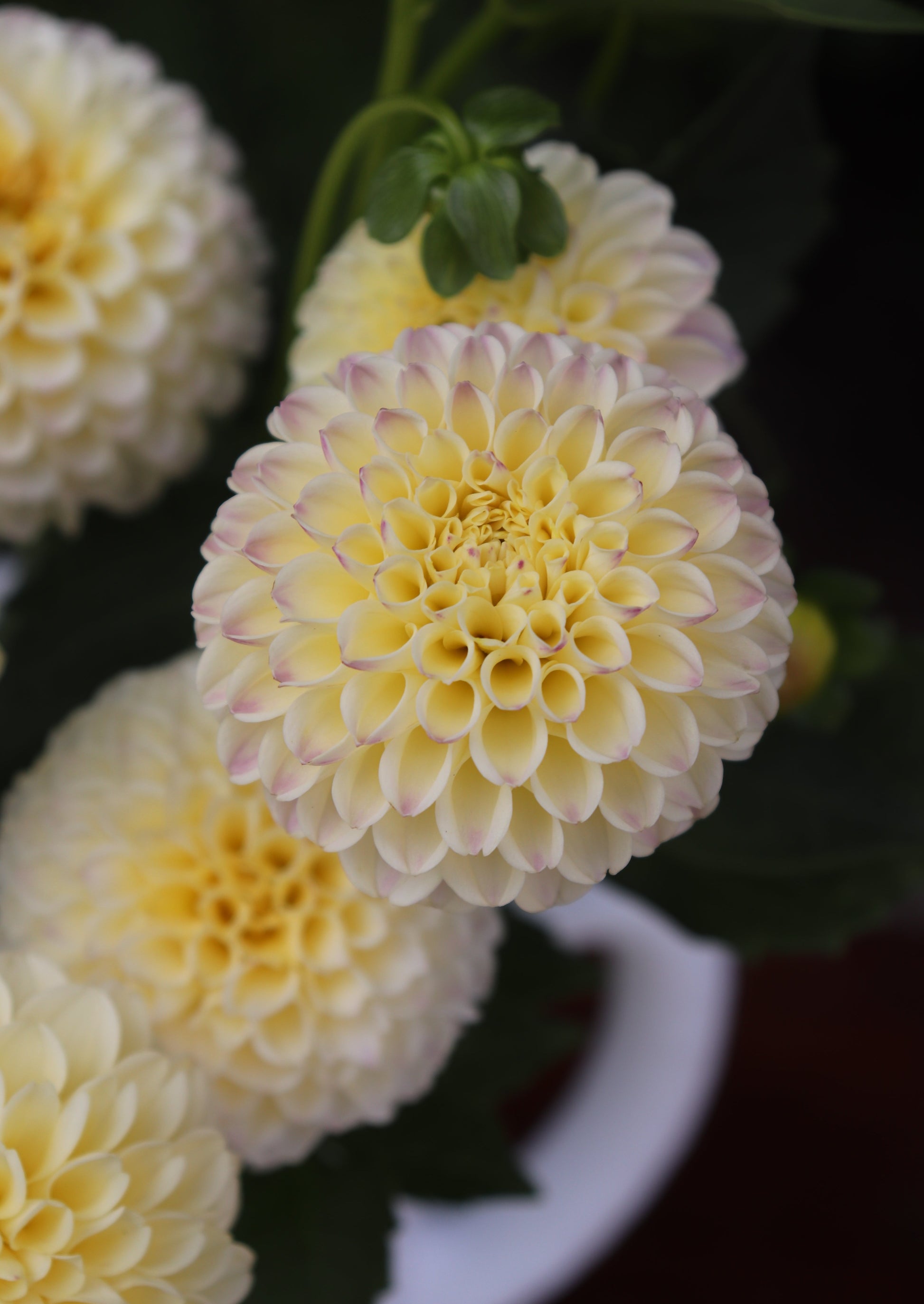 Blooms are the softest creamy yellow, with a hint of pink kissing the petal tips. Her small stature tucks nicely into bouquets and she blends with so many other colors.
