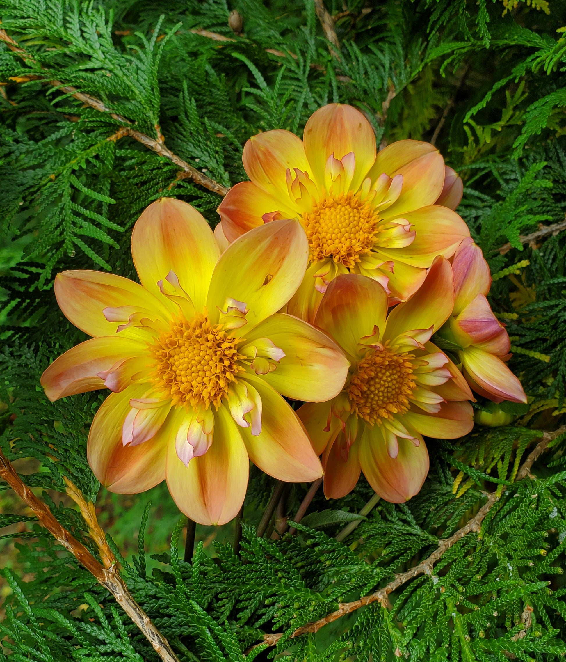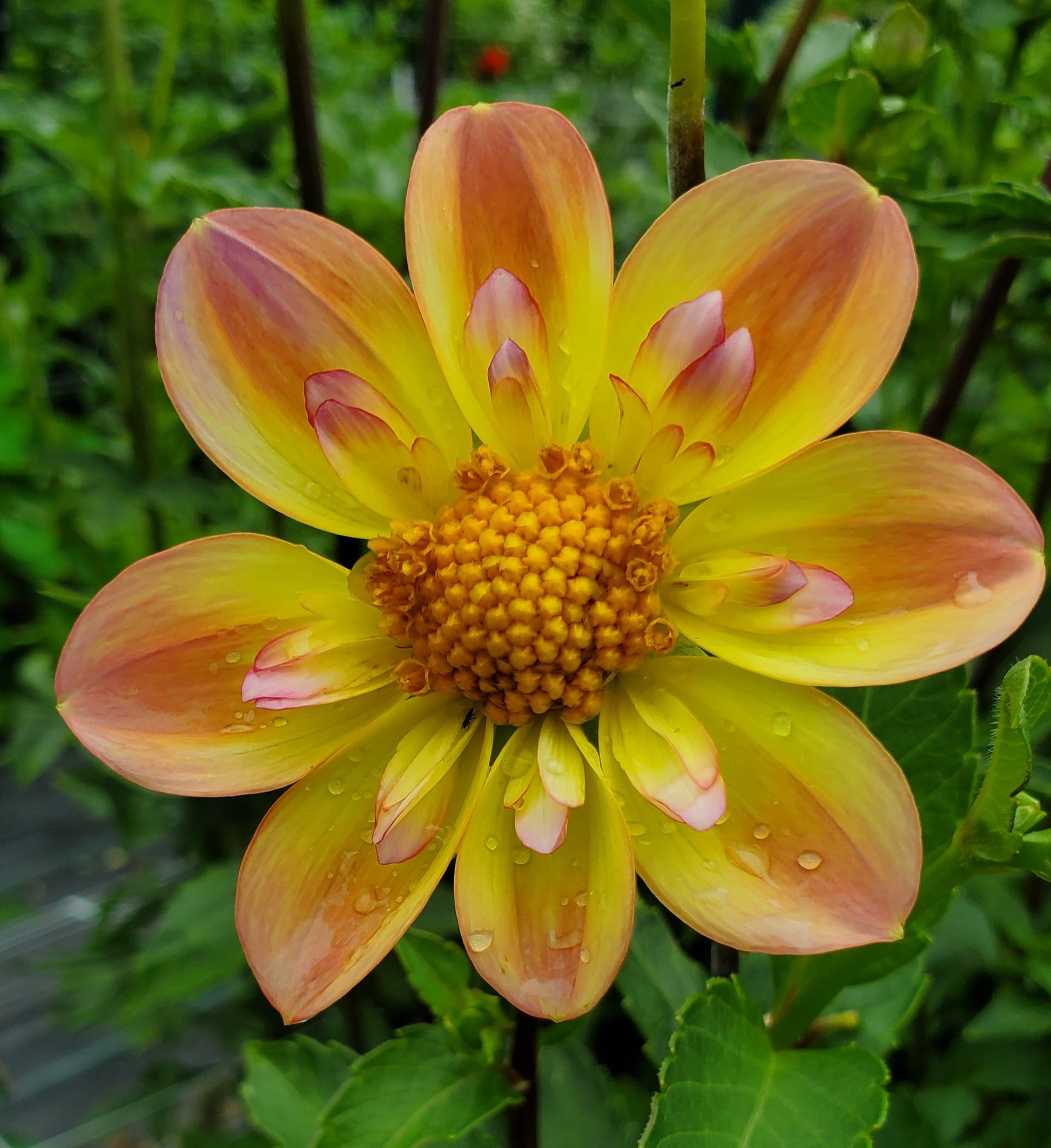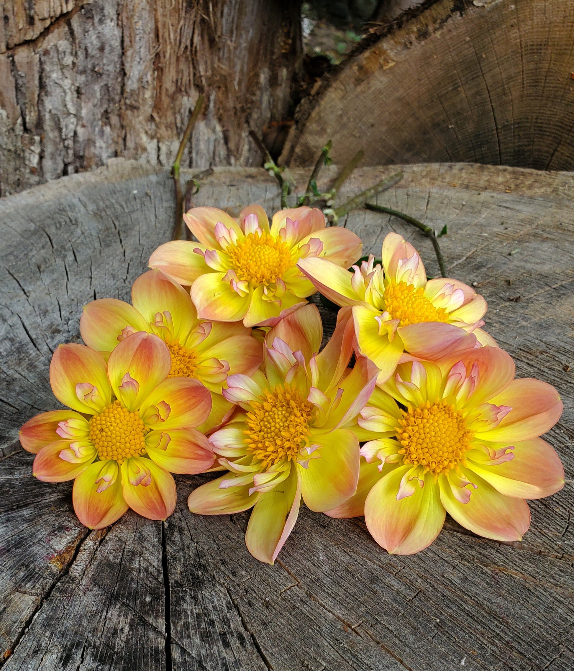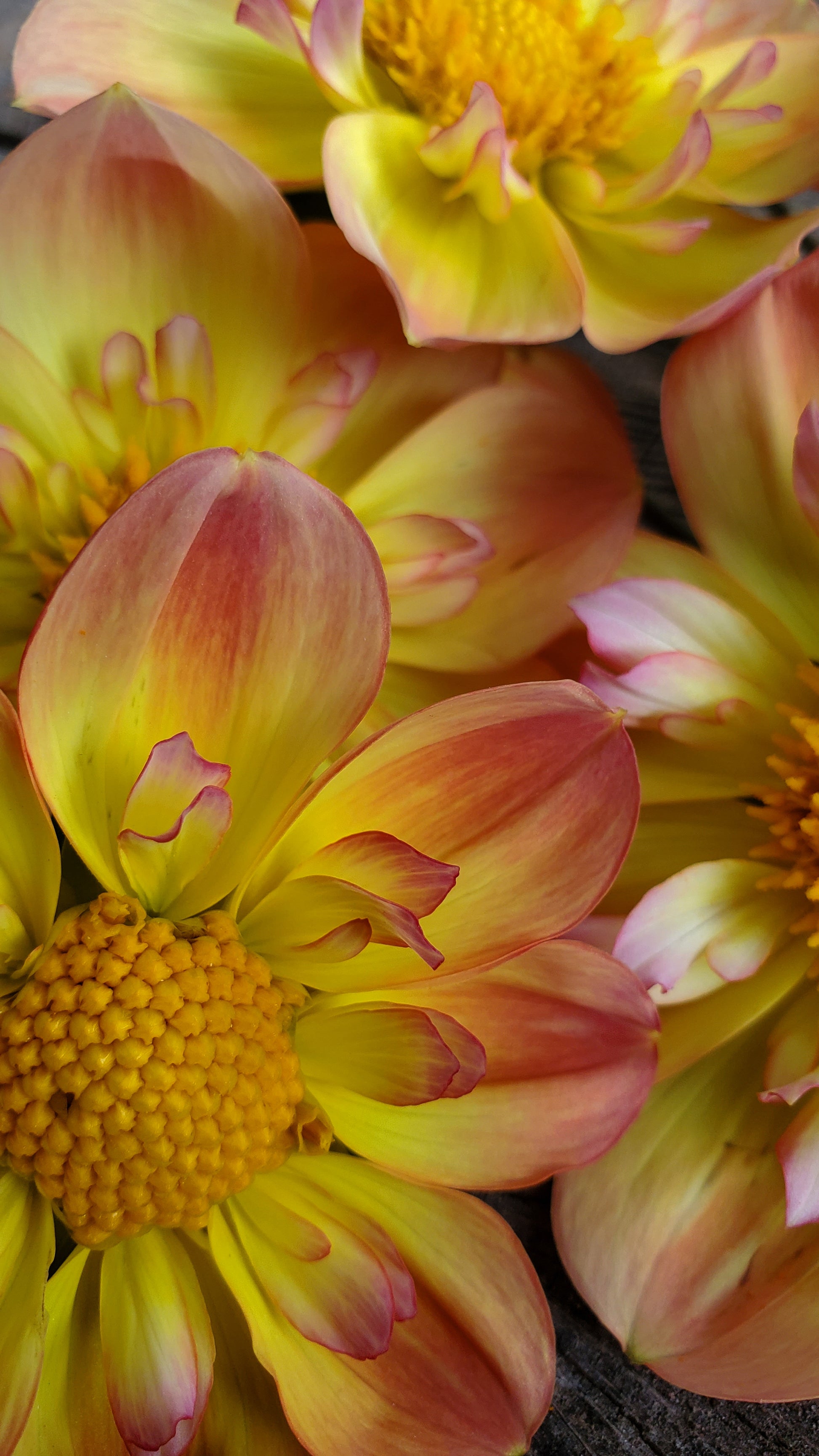 An enchanting collarette, with an almost green-yellow base swathed with a paint brush stroke of orange-red down the center of each petal. Eileen's petaloids have the most beautiful red raspberry picotee edge. If you love your collarettes, she's a must for the garden.