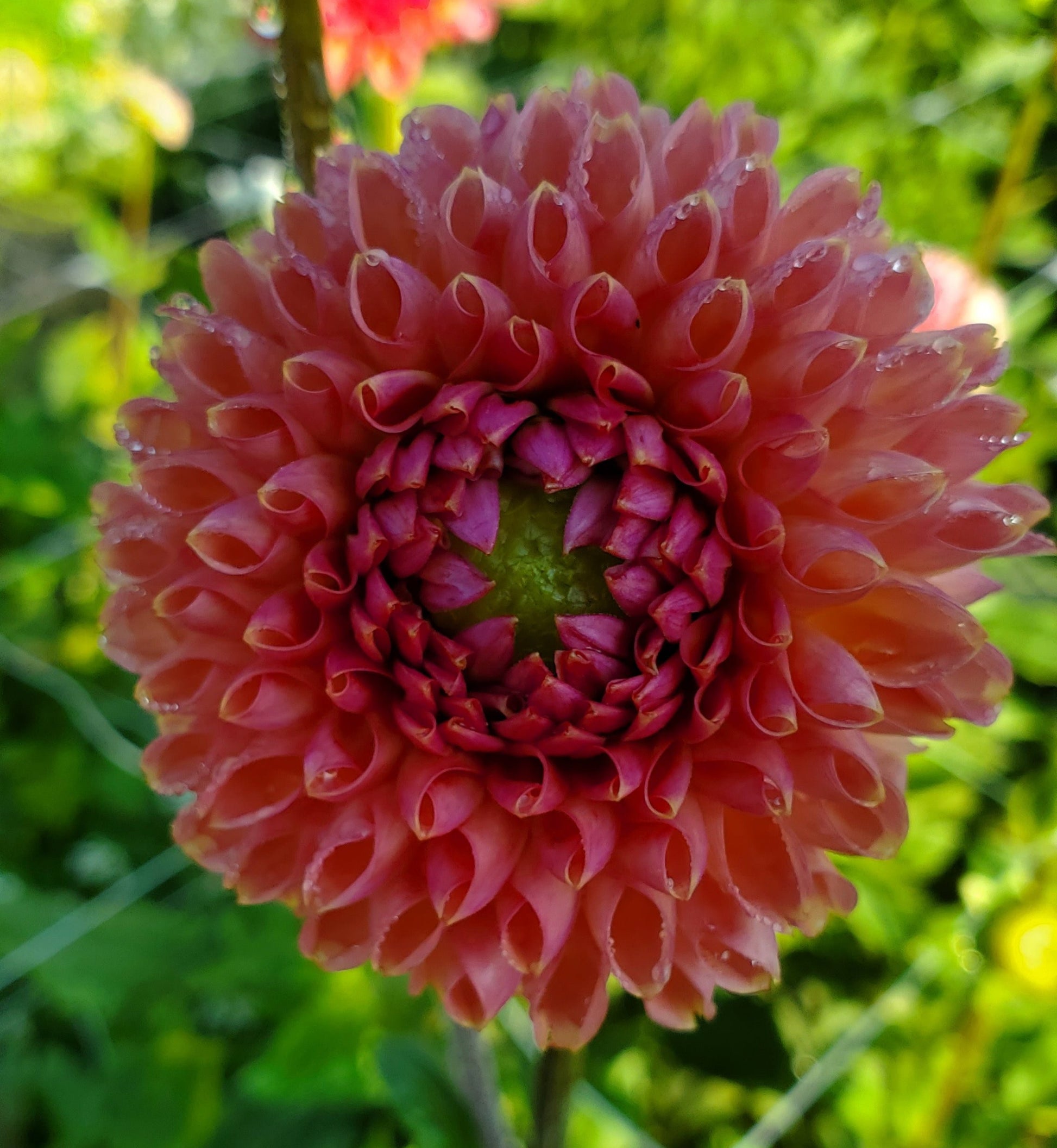 A dark blend ball, almost on the bronze side of color. The center can drift towards a purple tinge, and it will work with any peach or coral palette. straight, strong stems for cutting.