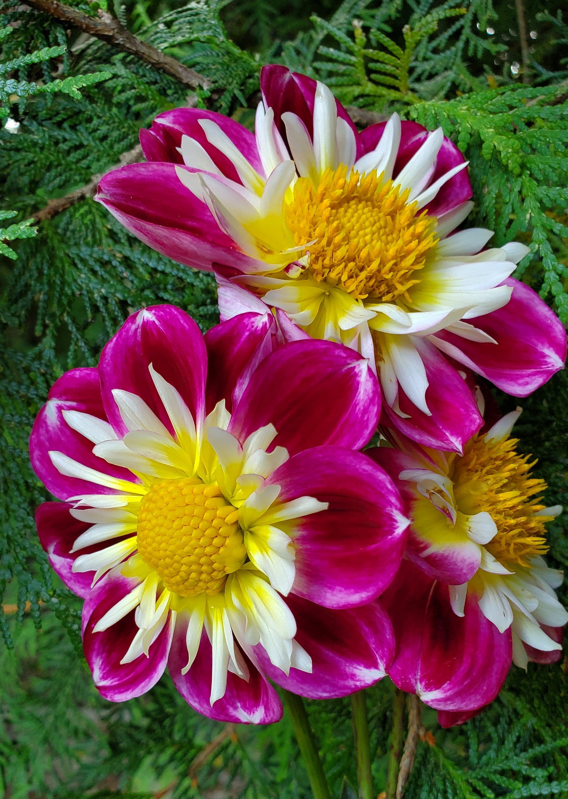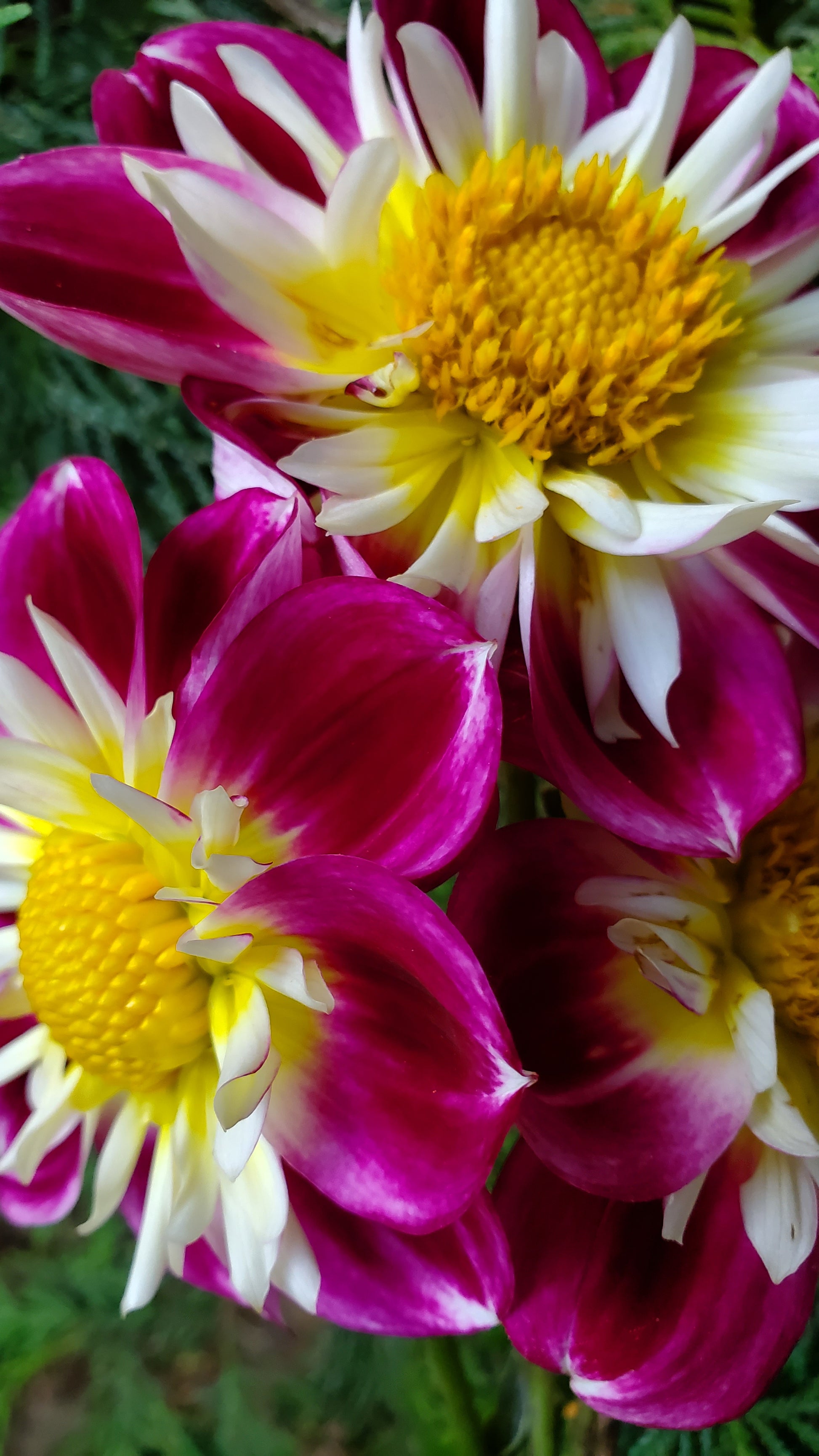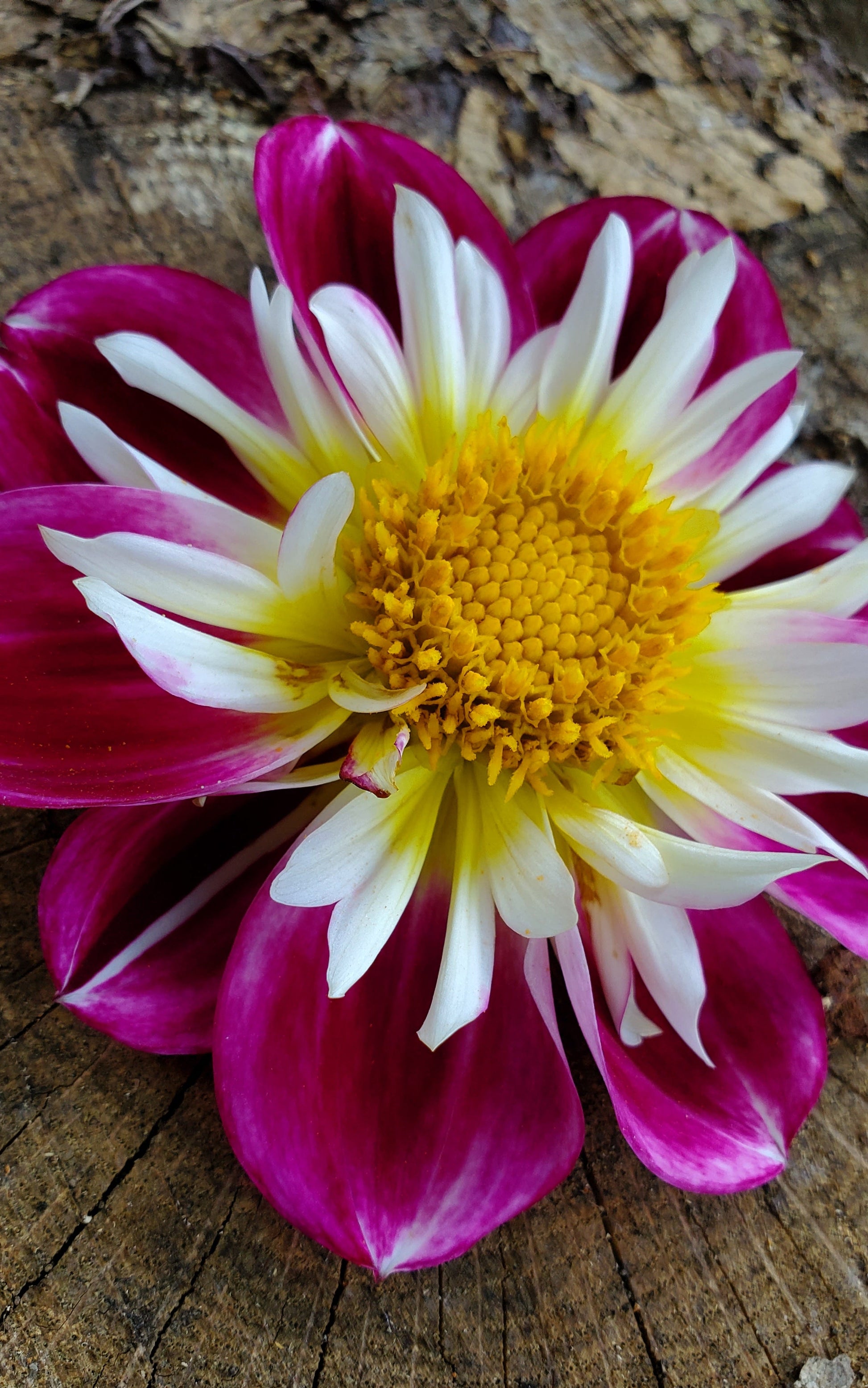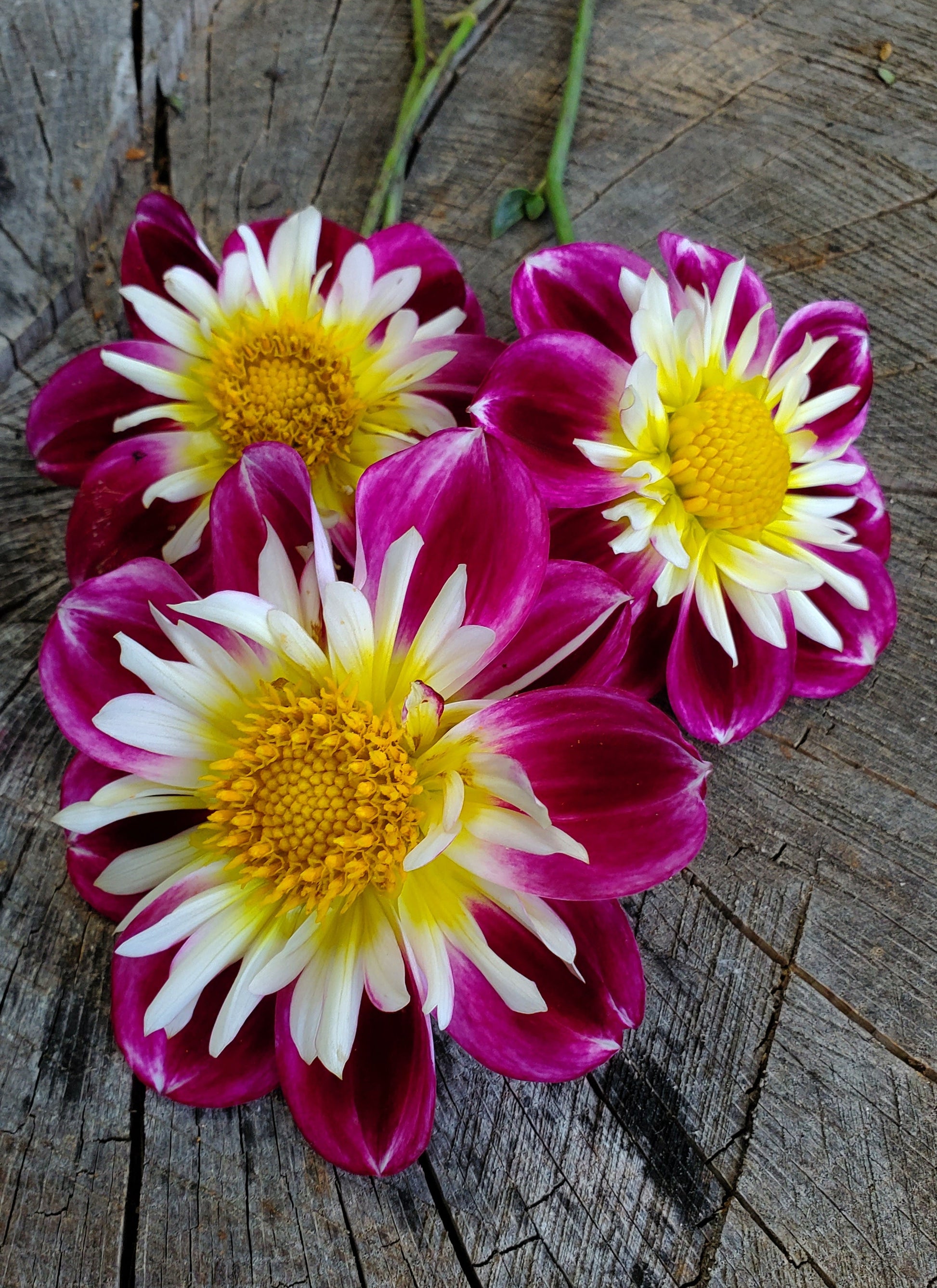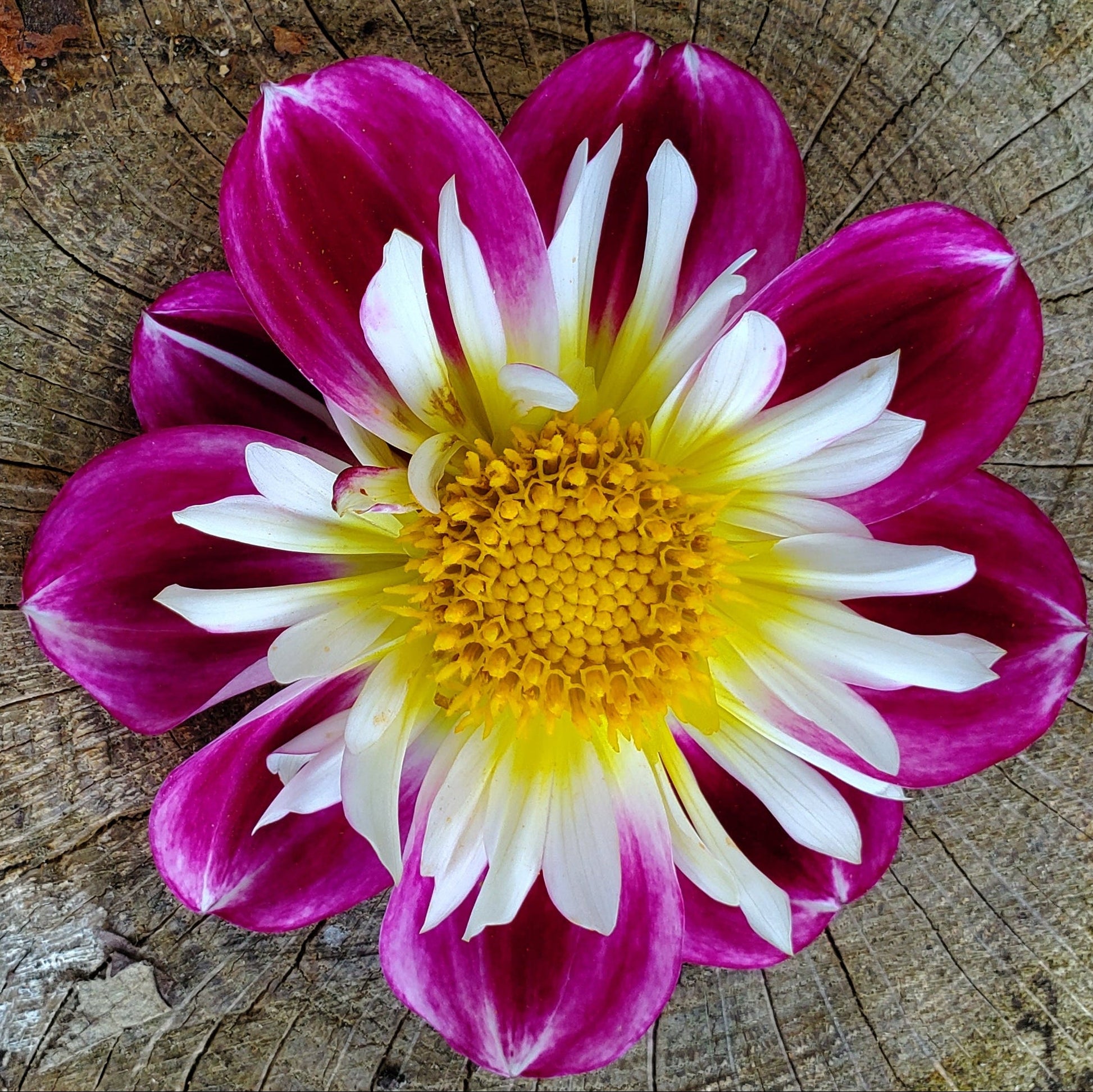 This Collarette makes one stop in their tracks! The contrast between the white petaloid with the bright yellow center and her deep magenta petals is "WOW'! She's absolutely stunning! A true stand out in the garden or cutting field.