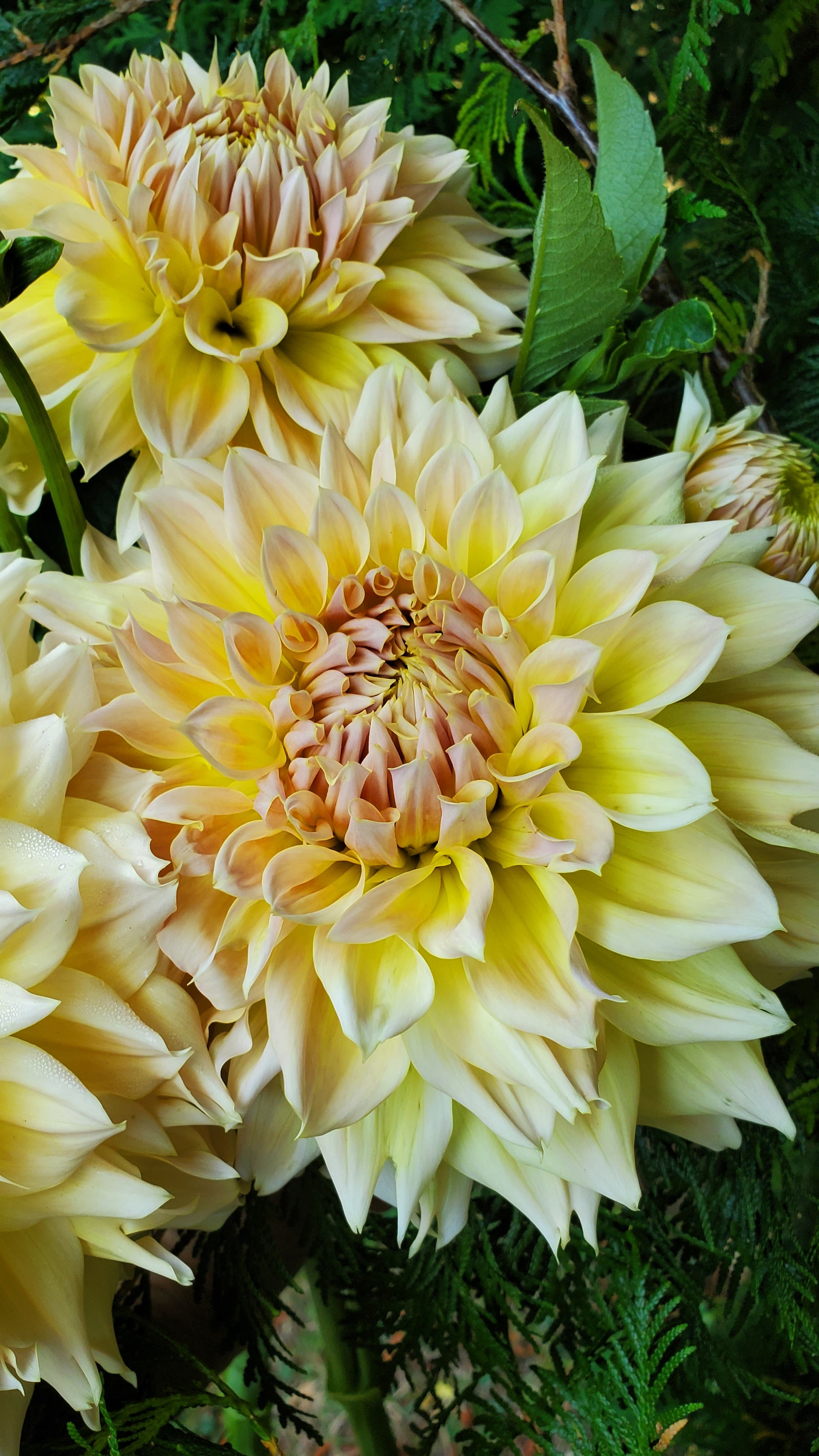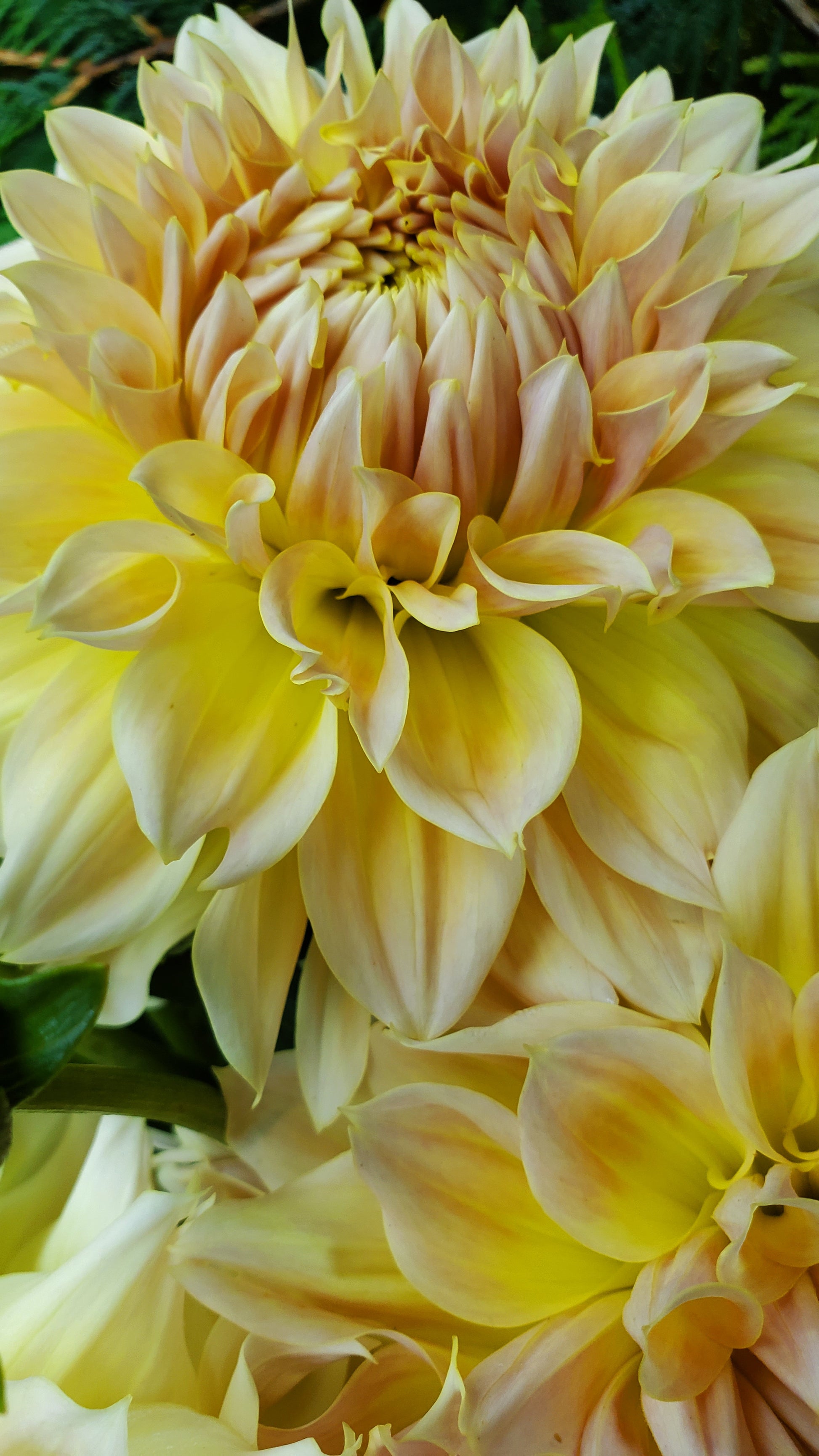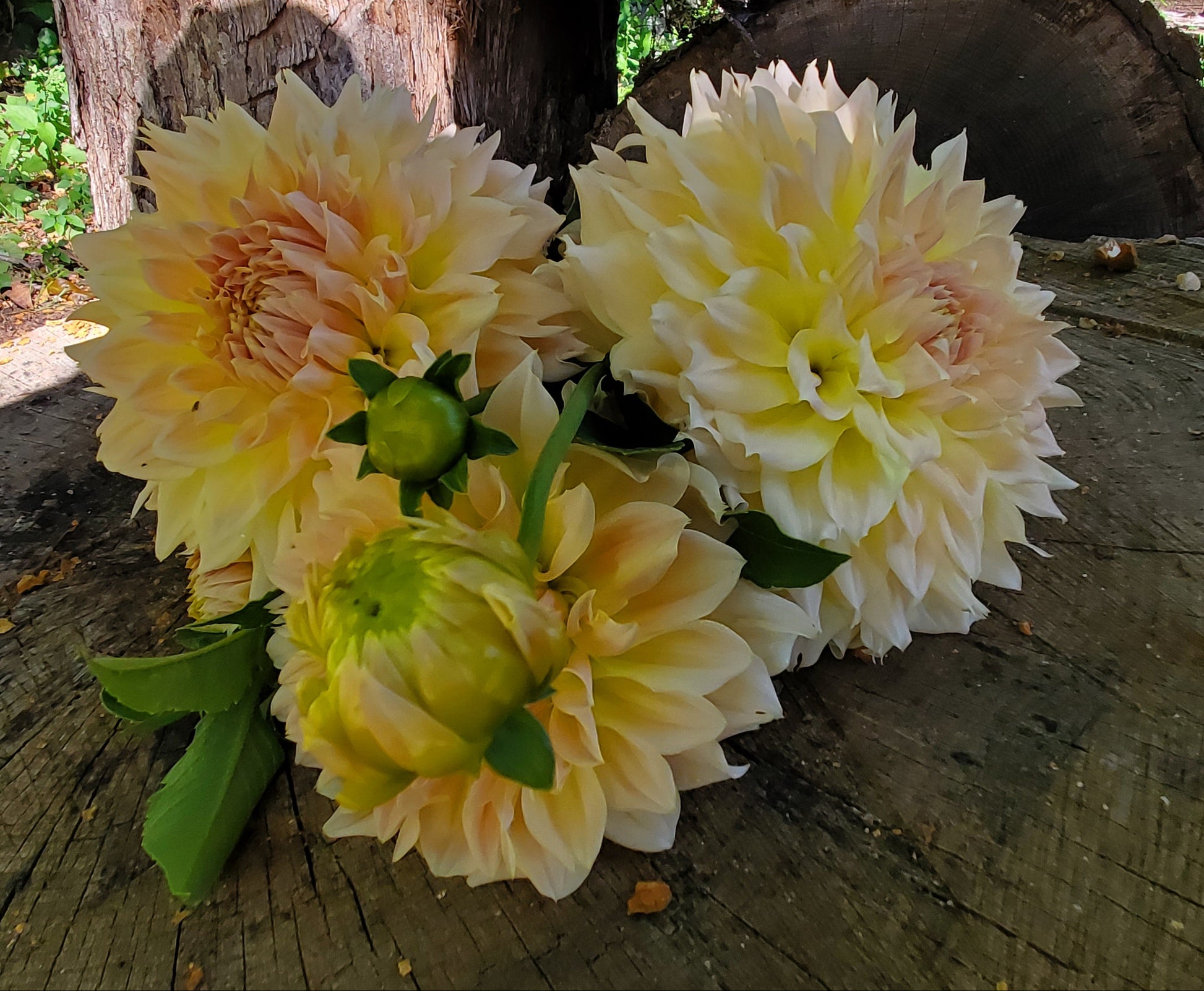A magnificent butter yellow dahlia with blush centers. She begs one to stop and say hello, leaving with a smile on your face. This dahlia exudes happiness and joy, plus she is stunning in a vase. A personal favorite.