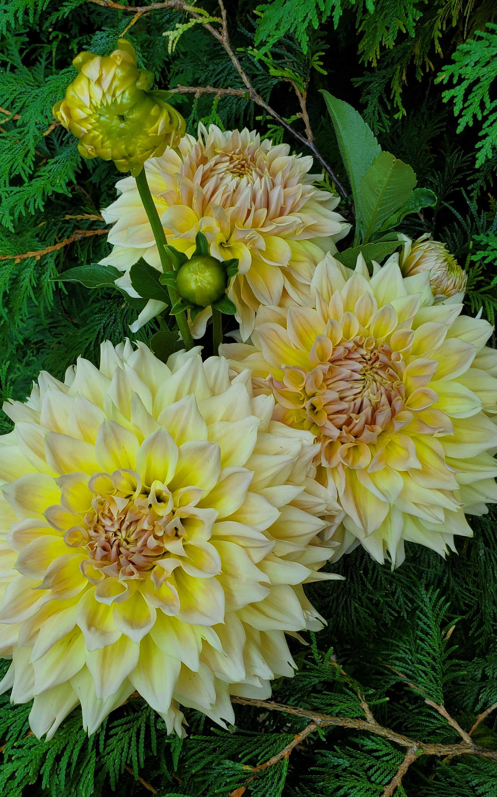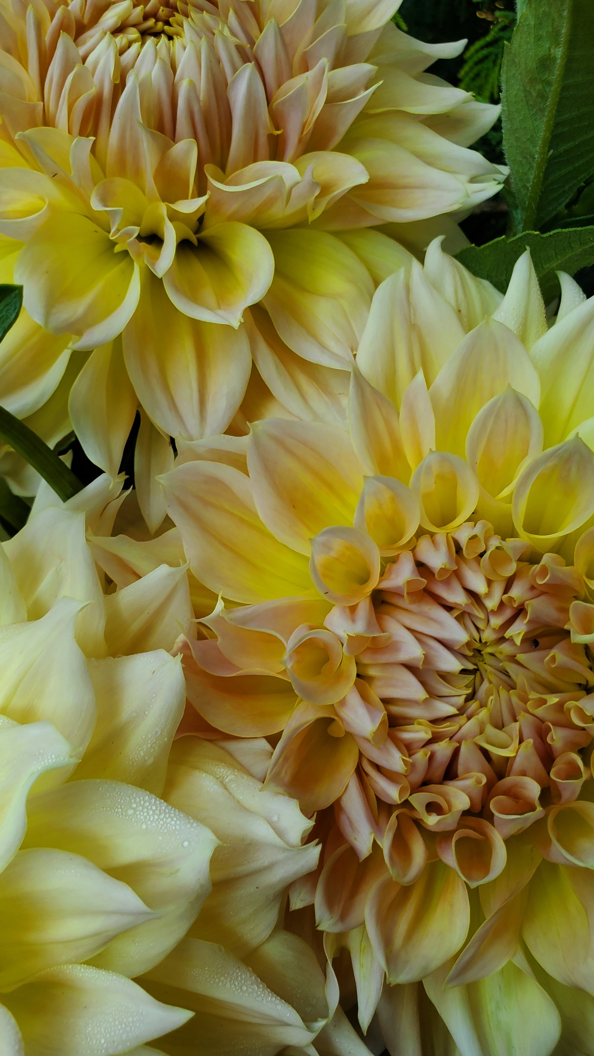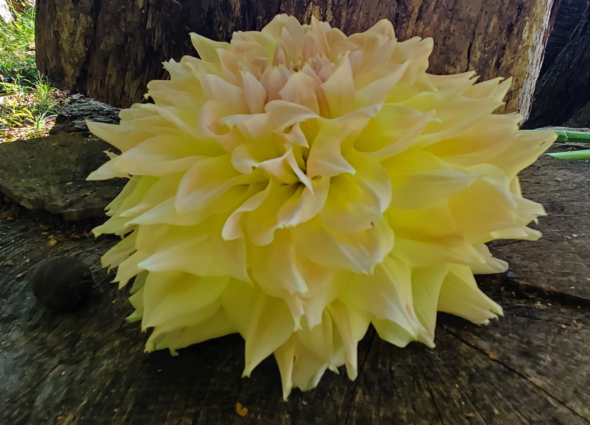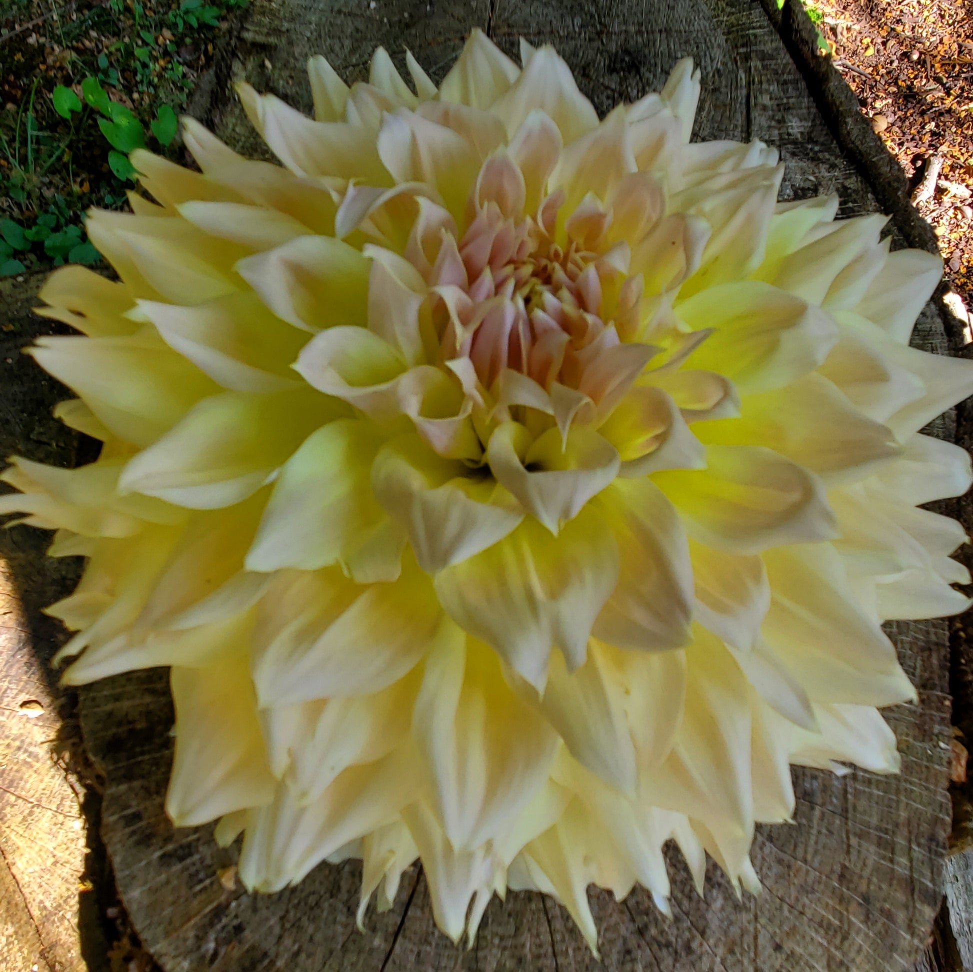 A magnificent butter yellow dahlia with blush centers. She begs one to stop and say hello, leaving with a smile on your face. This dahlia exudes happiness and joy, plus she is stunning in a vase. A personal favorite.